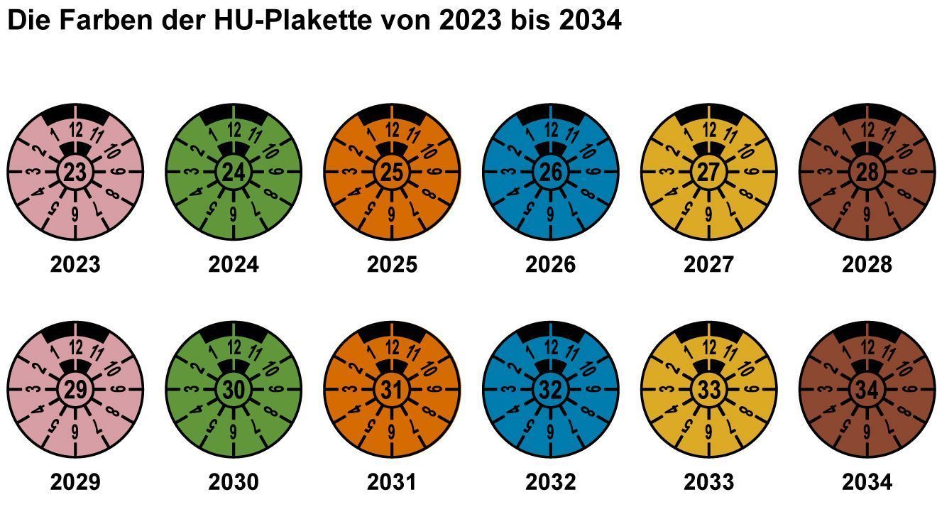 Die Farbe der Plakette hilft, das Jahr der aktuellen Prüfung schnell zu identifizieren. Das Schema folgt dabei einem festen Zyklus. Die Farbe der Plakette wiederholt sich in einem Rhythmus von sechs Jahren.